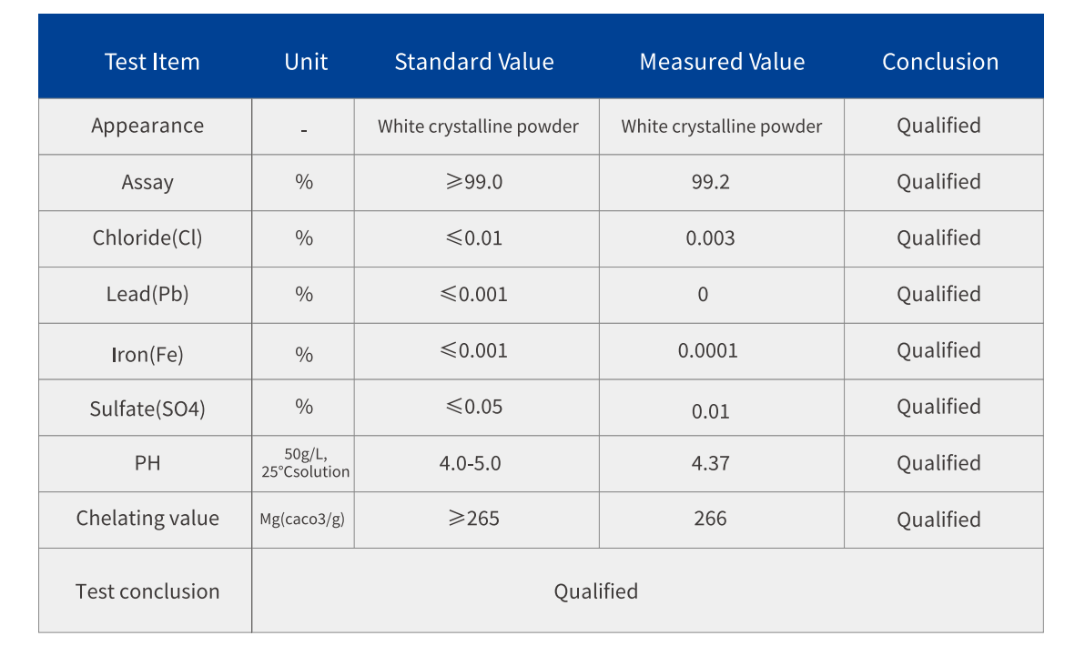 Parmi les sels de l’acide éthylènediaminetétraacétique, le sel disodique est le plus important. C’est un agent complexant important. Il est utilisé dans le placage chimique du cuivre, la dorure, le placage d’alliage plomb-étain, le polissage électrochimique des pièces en acier et les solutions de prétraitement pour l’argenture des pièces en cuivre. Il peut également être remplacé par l’EDTA-Na. Il est également utilisé dans les détergents, les savons liquides, les shampoings, les pulvérisations de produits chimiques agricoles, les solutions de rinçage, de traitement, de blanchiment et de fixation des matériaux sensibles à la couleur, les purificateurs d’eau, les régulateurs de pH, les anti-floculants, etc. Dans le système d’amorçage par réduction utilisé pour la polymérisation du caoutchouc styrène-butadiène, l’EDTA disodique sert de composant de l’agent actif, principalement pour complexer les ions fer et contrôler la vitesse de réaction de la polymérisation.